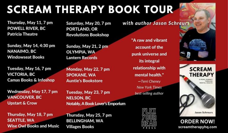 And I’ve always been a DIY punk, and my home is in Powell River, off the Sunshine Coast of BC. Flex Your Head Press is my own publishing company, and I’m almost sold out of the first print run! I may have like 200 copies left by the end of the tour. As soon as AK Press distributes it in the States, it’ll be more widely available. Right now, it’s way easier for me to fill orders from the basement punk rock style than to have it filled by some other company.